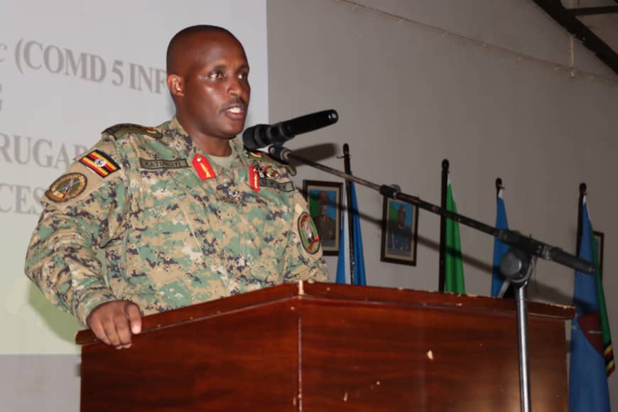 Maj Gen Keith Katungi, Commander UPDF 5 Infantry Division, delivering a lecture of opportunity at BMTS-Kaweweta.