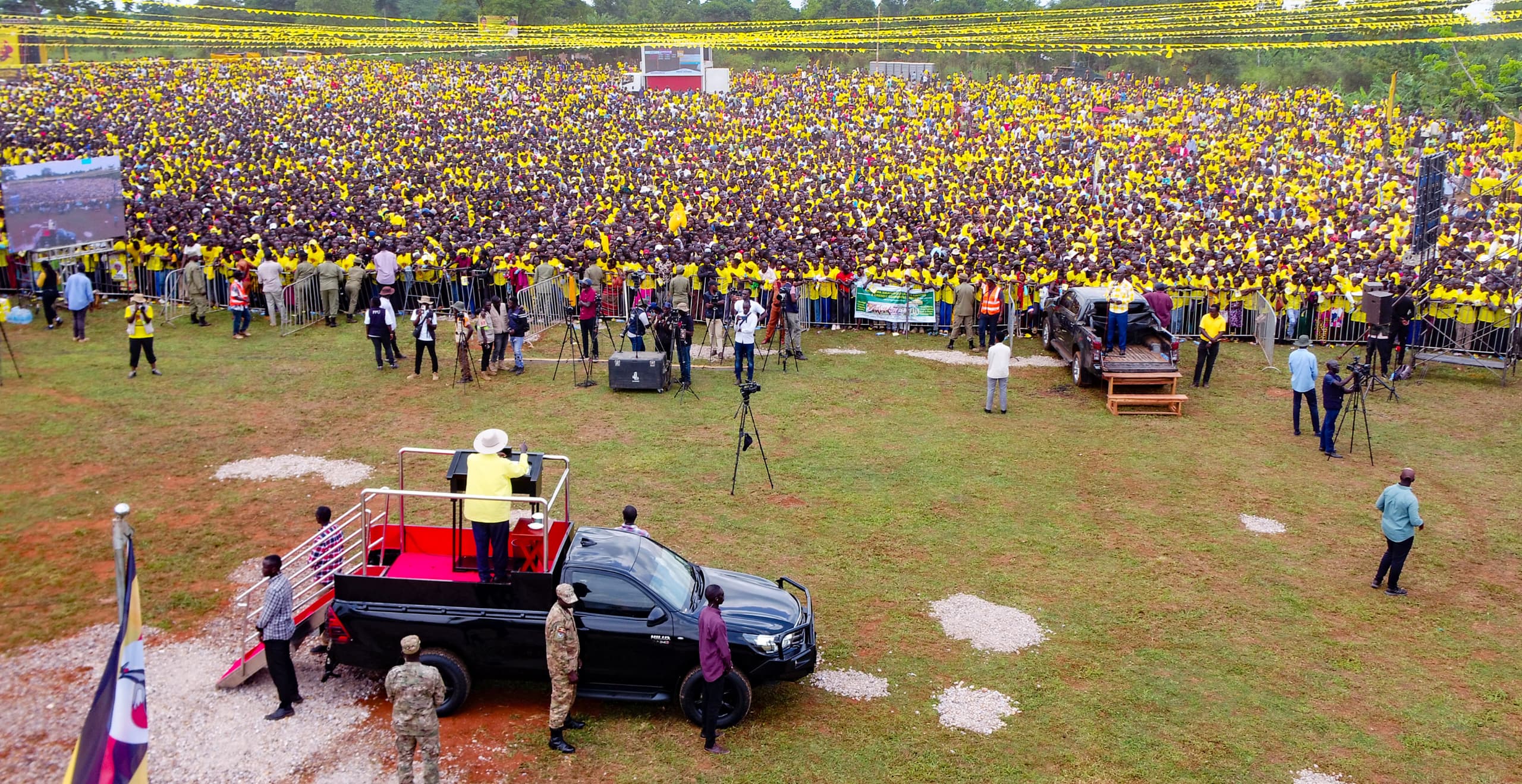 President Yoweri Kaguta Museveni drew a mammoth crowd in Busia District, with supporters filling the grounds of Buwanda Primary School to the brim and spilling far beyond the school perimeter as he delivered his campaign message.