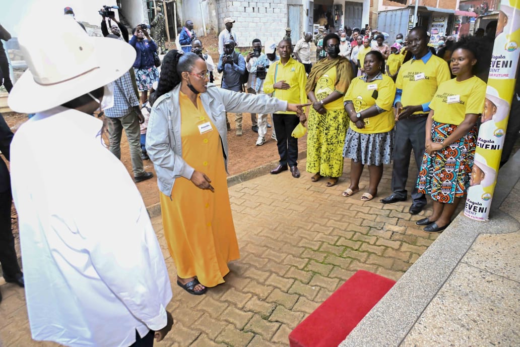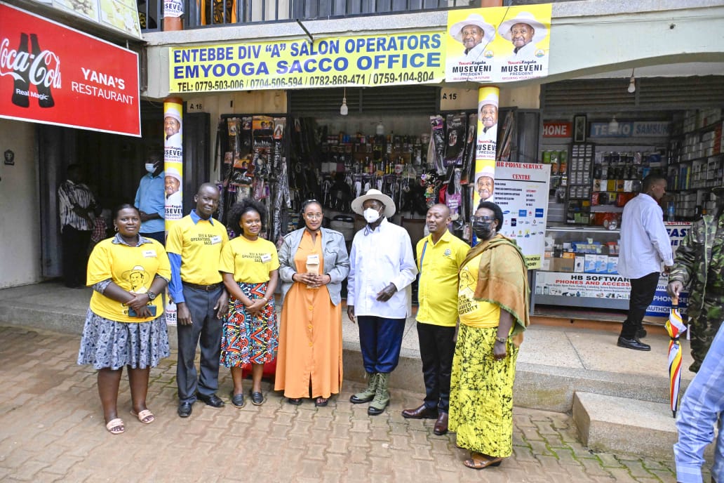 At an earlier engagement in Kitoro, Entebbe Municipality, President Museveni visited a hair salon owned by Ms. Priscilla Mwirumubi, a beneficiary of Emyooga, through the Entebbe Diva Salon Operators Emyooga SACCO.