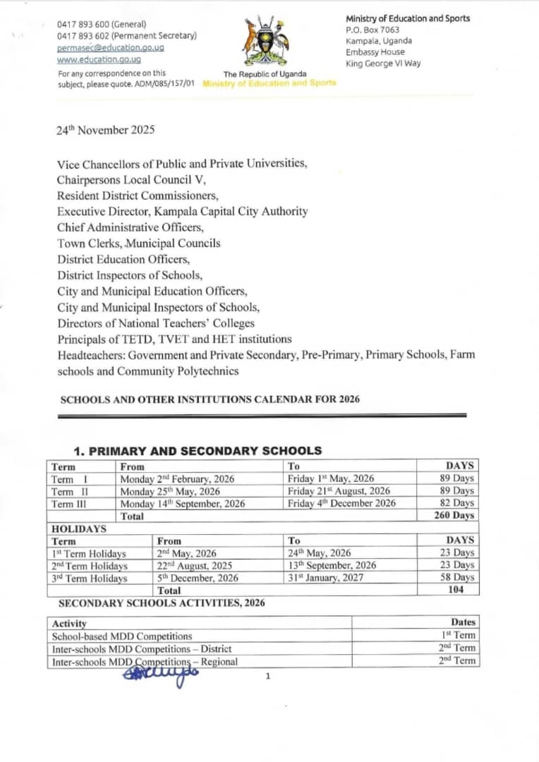 In a statement dated January 6, 2026, the Permanent Secretary Kedrace Turyagyenda said the information is untrue and should be disregarded, emphasizing that there has been no change to the approved national school calendar for the 2026 academic year.